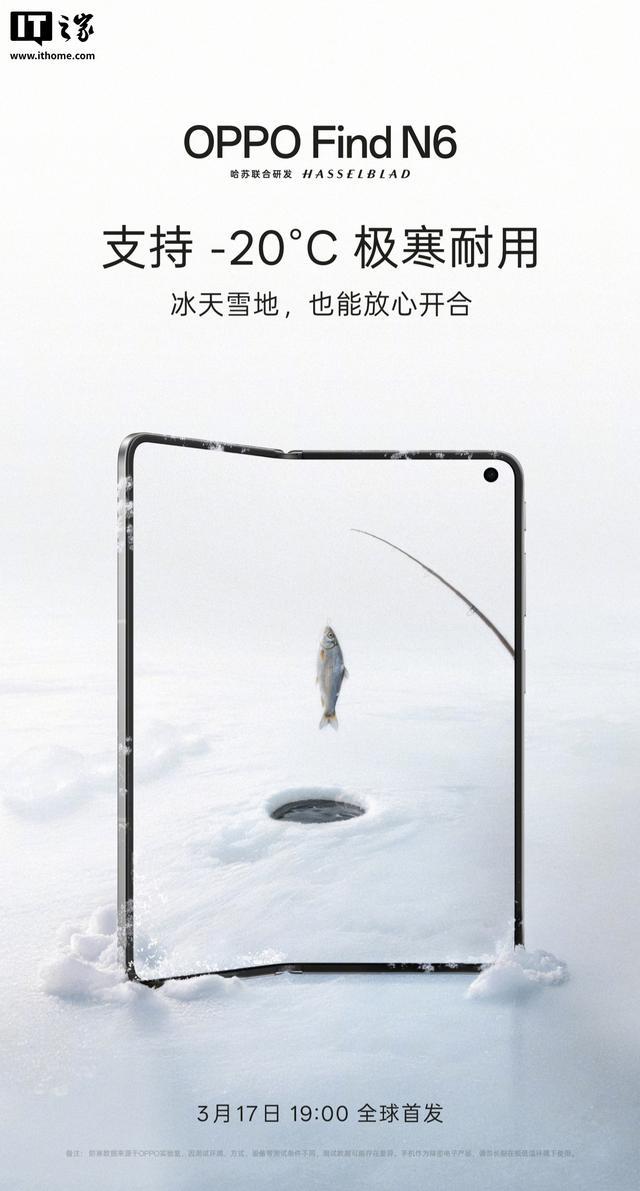 IT之家 3 月 12 日消息,OPPO 官方今日继续预热 Find N6 折叠屏手机。新机将支持 IP59、IP58、IP56 满级防水和 -20°C 极寒耐用,宣称“冰天雪地放心开合”。